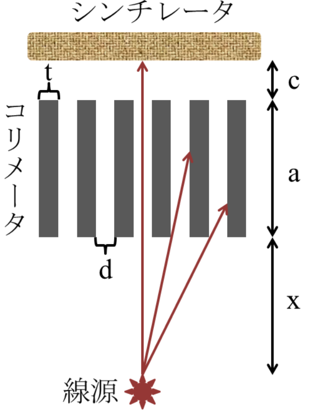 x:線源コリメータ距離  c:コリメータシンチレータ距離