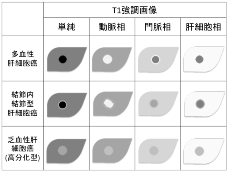 :単純CTで低濃度、動脈相で高濃度、門脈相で等価、平衡相で低濃度
